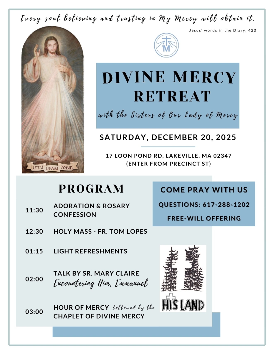 Come and spend some time of your Saturday under the rays of the Merciful Jesus. Day of Recollection includes Holy Mass, Adoration of the Blessed Sacrament, Confession, Conference by a Sister or a guest speaker, Prayer at the Hour of Mercy and the Divine Mercy Chaplet.