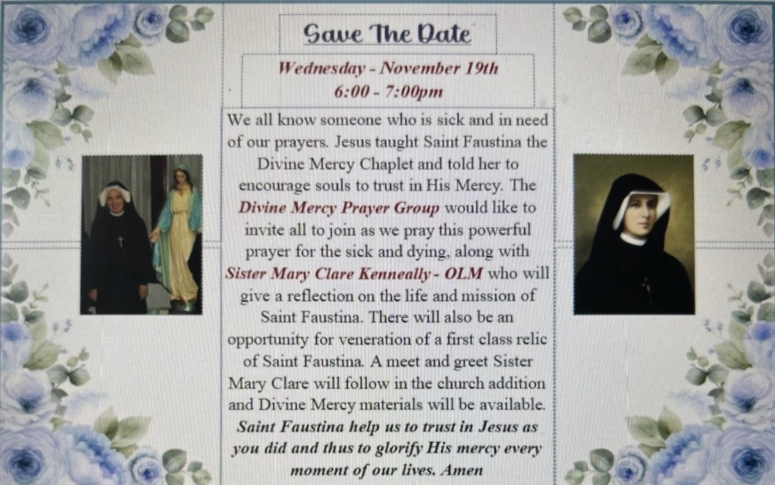 The Divine Mercy Prayer Group at St. Andrew the Apostle Parish in Taunton, MA invites you to join Sr. Mary Claire in reflecting on St. Faustina's life and mission and the gift of the Divine Mercy Chaplet.