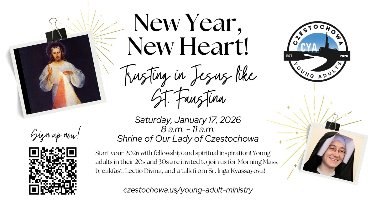 Start off the New Year 2026 with Czestochowa Young Adults in Doylestown, PA! Join us for Mass, breakfast, Lectio Divina with Fr. Timothy, talk on Saint Faustina by Sister Inga, and fellowship!